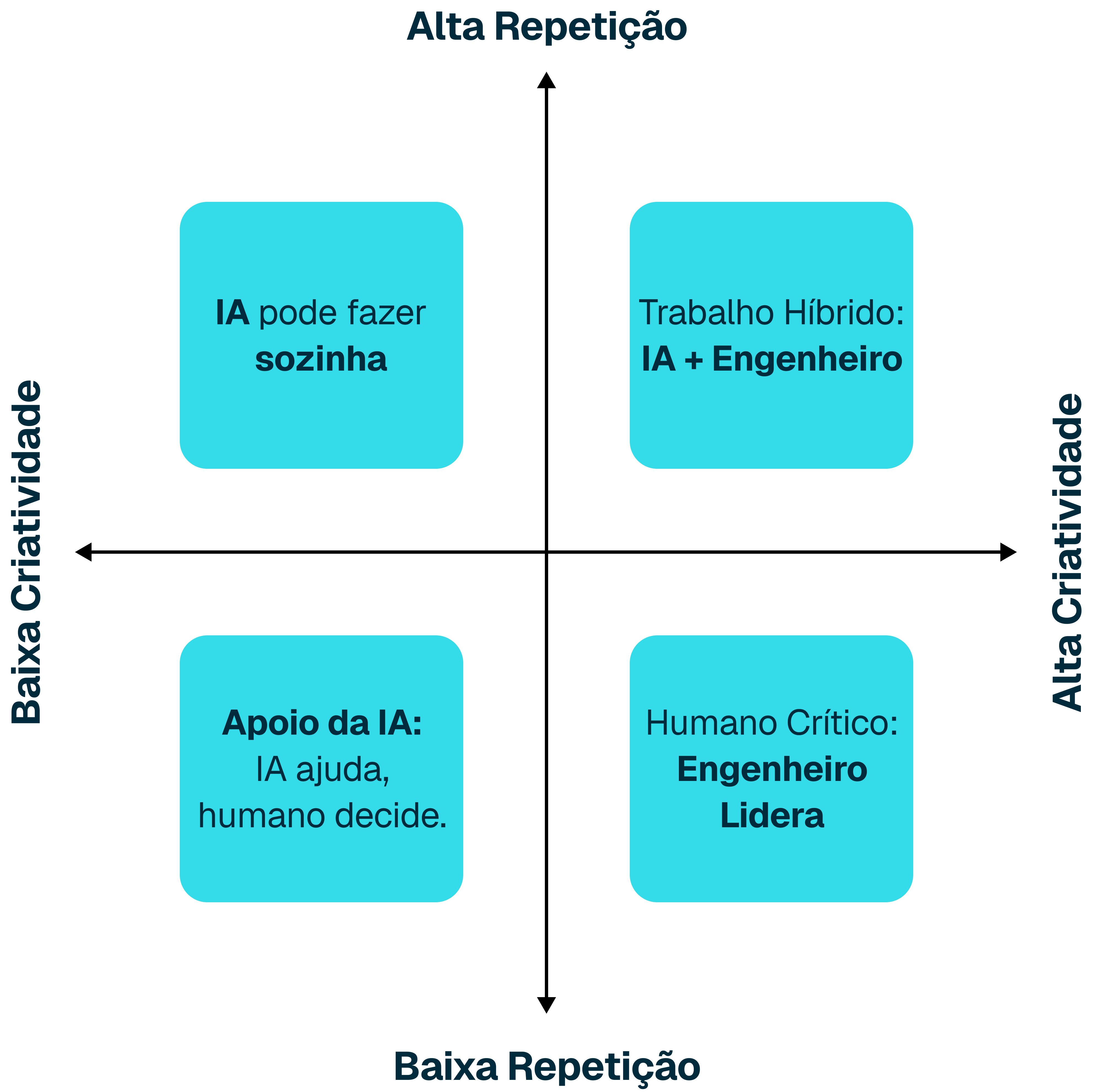 Esse quadrante é, na minha opinião, o mais interessante. Aqui mora a colaboração real, onde humanos e IA somam forças: a máquina analisa, processa dados e apresenta cenários, enquanto nós, engenheiros, ponderamos fatores subjetivos, contexto e experiência para tomar decisões melhores.
